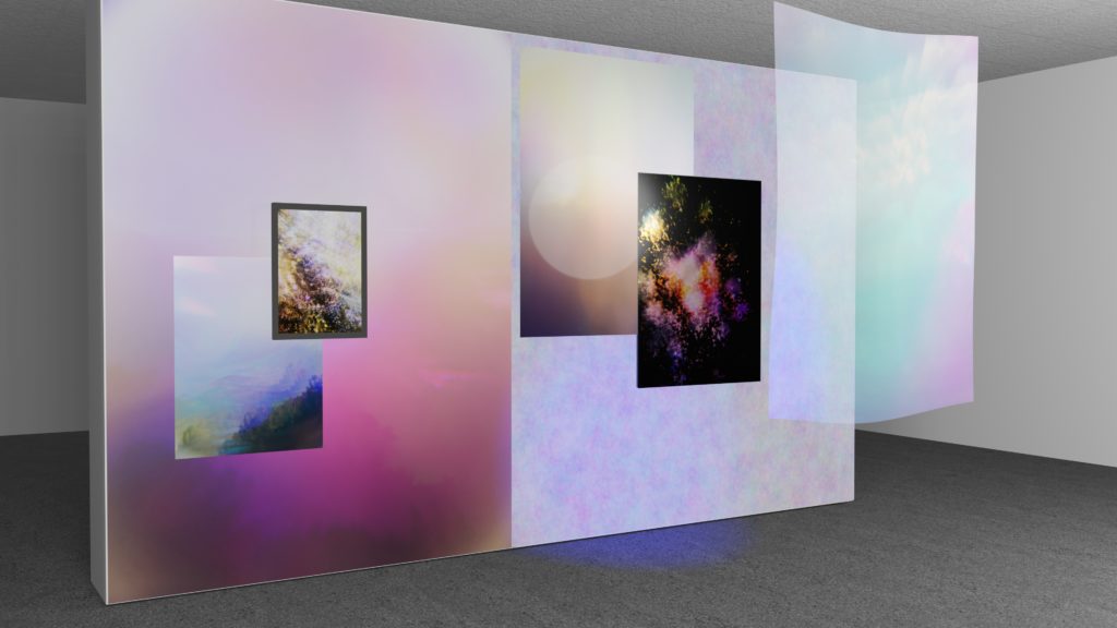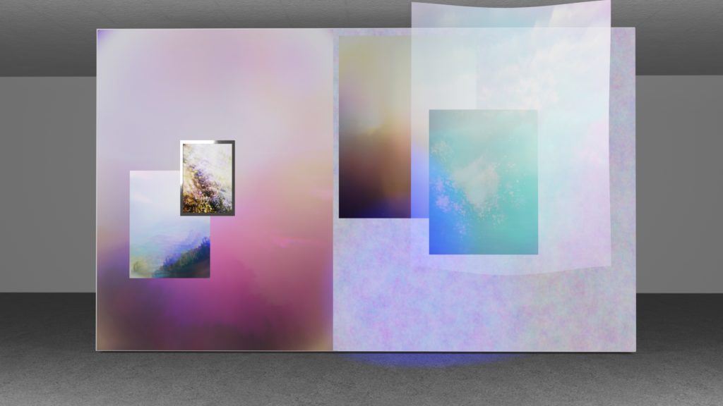 Présentées sur des supports variés (mats, brillants, semi-transparents) et selon des formats multiples, les images s’assemblent sur un pan de mur, se superposent et composent des strates de lecture. Une photographie, imprimée sur un voile de tissu, laisse deviner en filigrane celle placée à l’arrière-plan, créant un jeu de transparence et de résonance lumineuse. Par ces glissements de surface et ces variations d’échelle, l’installation invite le spectateur à plonger dans un environnement onirique et sensible, où les lumières se croisent, s’additionnent et s’embrassent.