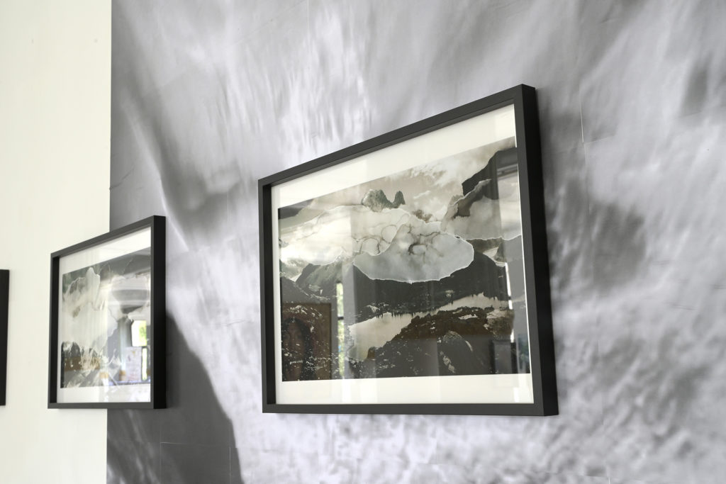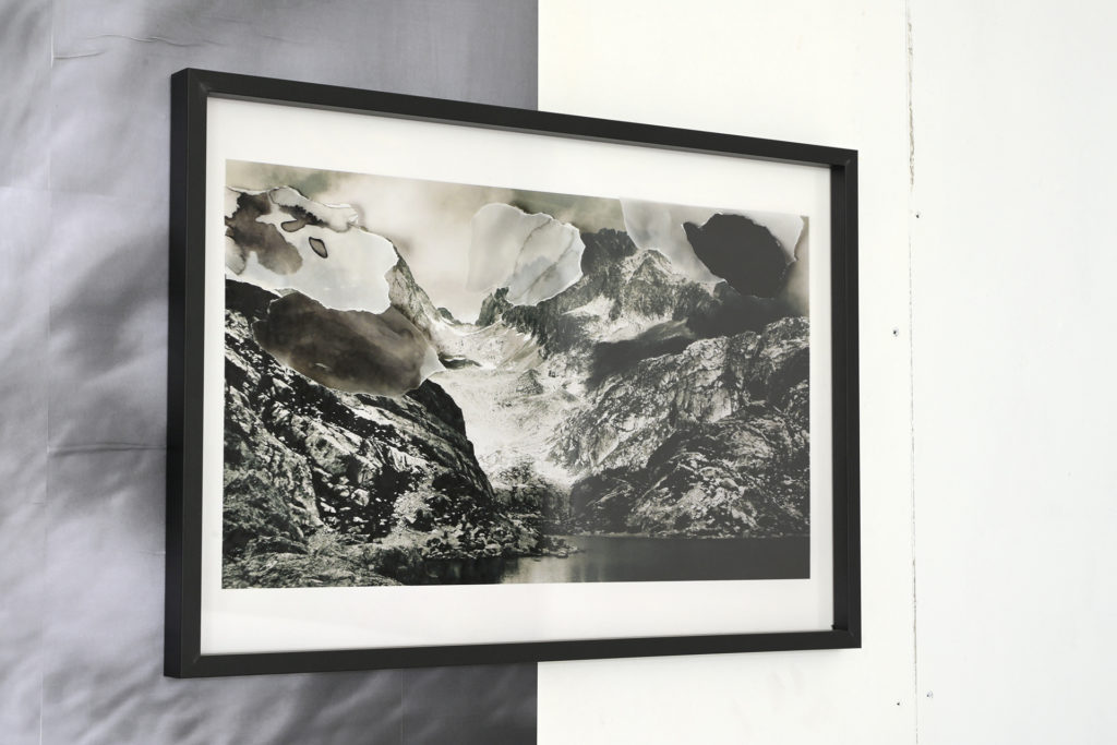 Cette série d’images résulte d’un ensemble de manipulations où la photographie devient le support d’une expérimentation plastique. À partir d’un premier tirage numérique, j’y dispose délicatement des fragments de papier calque teintés à l’encre noire. La composition ainsi obtenue est de nouveau photographiée, laissant apparaître les ombres, les plis et les aspérités du matériau. Le calque, posé en surimpression sur les nuages de l’image initiale, introduit une nouvelle strate de lecture : un voile qui dissimule partiellement les sommets, comme pour refuser de voir les glaciers qui s’effacent.